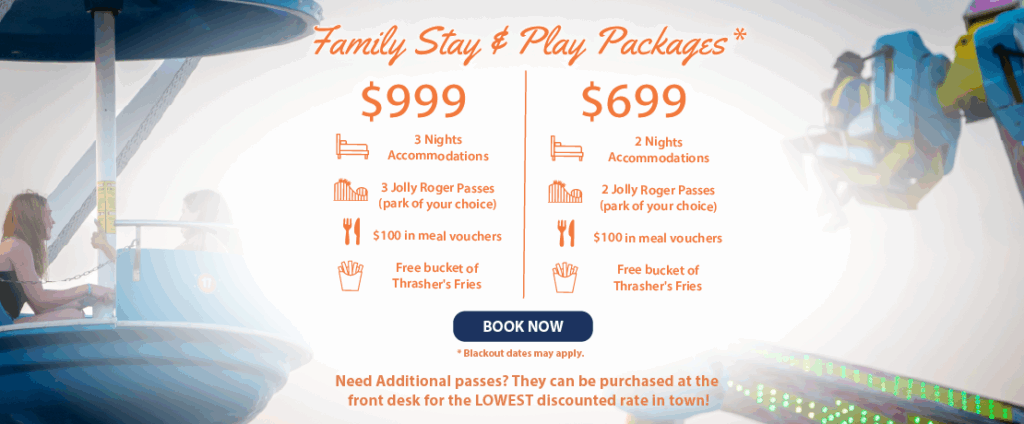 3 Nights Accommodations 3 Jolly Roger Passes (park of your choice) $100 in meal vouchers Free bucket of Thrasher’s Fries $999 2 Nights Accommodations 2 Jolly Roger Passes (park of…